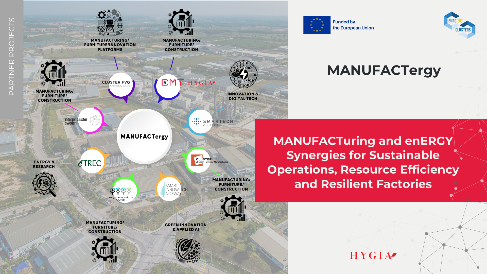 Projekt MANUFACTergy si klade za cíl koordinovat přechod k ekologičtějšímu, více digitalizovanému a odolnějšímu průmyslu pro malé a střední podniky (MSP) v sektorech nábytku a stavebnictví. Prostřednictvím svých aktivit projekt identifikuje zranitelnosti a závislosti v dodavatelských a výrobních řetězcích, podporuje energetickou účinnost a rozvoj udržitelných řešení.